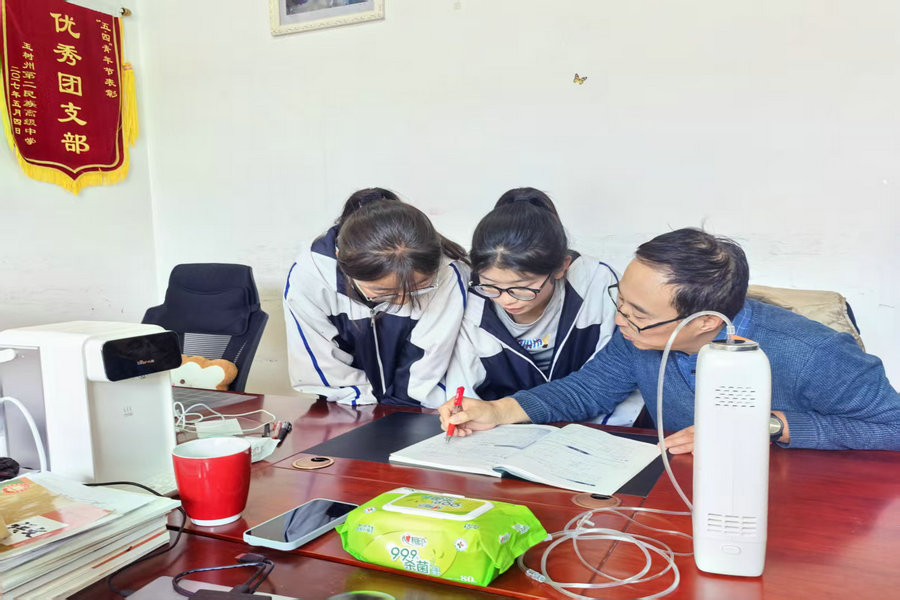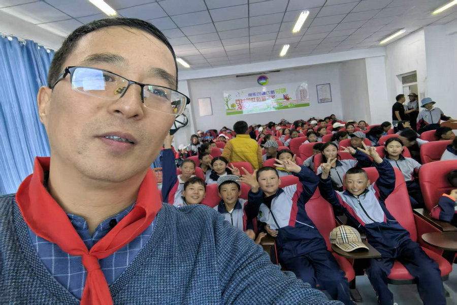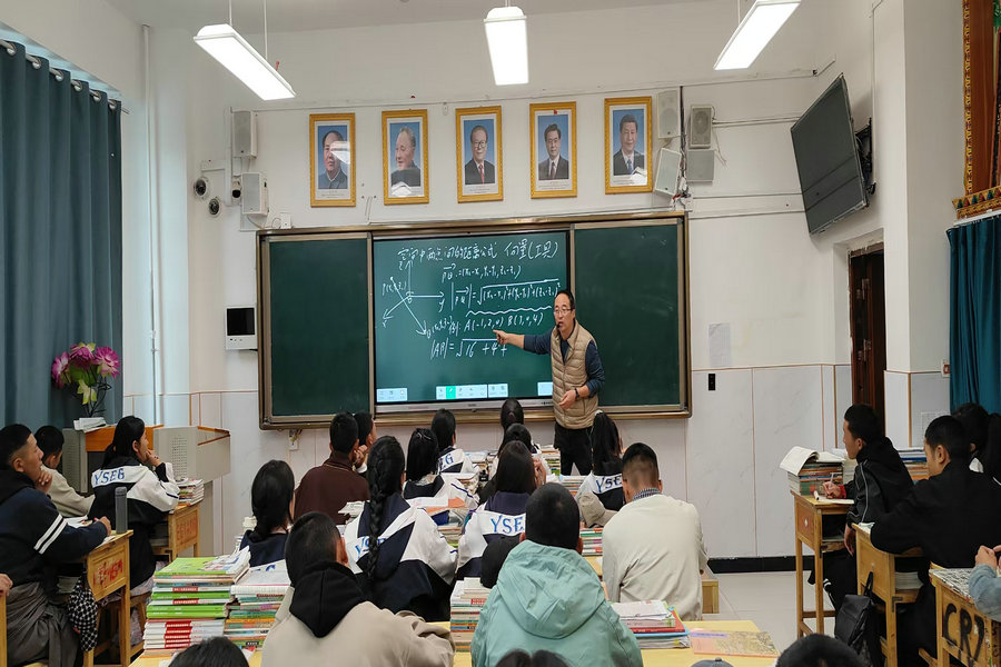初到海拔高、氧气稀薄的玉树,会出现胸闷气短和失眠的情况,还会遇到紫外线强烈的问题、但这些都没能阻挡他的教学热忱。他扛起高二年级两个班每周12节课的教学任务,每周2次值守晚自习、每两周1次全程在校值班督导,从晨光熹微到夜色深沉,校园里总能看到他忙碌的身影。针对当地学生特点,他创新推出“小台阶、高营养”教学法,逐步提升了学生的计算能力和逻辑思维能力。将坚持十年的“小黑板”学习模式带到玉树,让办公室前排起解题长队,让数学学习变得生动有趣。