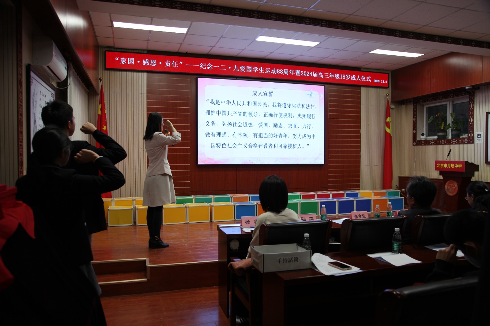 鲲鹏振翼,不惧前路漫漫;云帆高挂,且趁浩浩东风。2024年12月8日,北京市月坛中学举行了“家国・感恩・责任”纪念“一二·九”爱国学生运动88周年暨2024届高三学生十八岁成人仪式。张文生校长、殷桂范副校长、学生处杨凌主任、教学处陆燕主任、李伟主任、外事办安平主任、高三年级全体师生及家长、高一年级学生代表在学校礼堂参加本次大会,同时,高一、高二年级在教室内收看转播,共同见证了这庄严而难忘的时刻。大会由高三1班董子靖、高三2班张钰婕同学主持。
