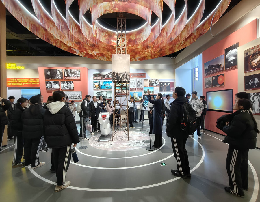 校门口设置的"高精尖创新成果学习展板"集中展示靶材、锂离子动力电池、大型高效智能浮选机等前沿科技成果,配合"人型机器人"实物展示,构建开放式的科技学习空间,供全校师生在课间驻足观摩、交流学习。