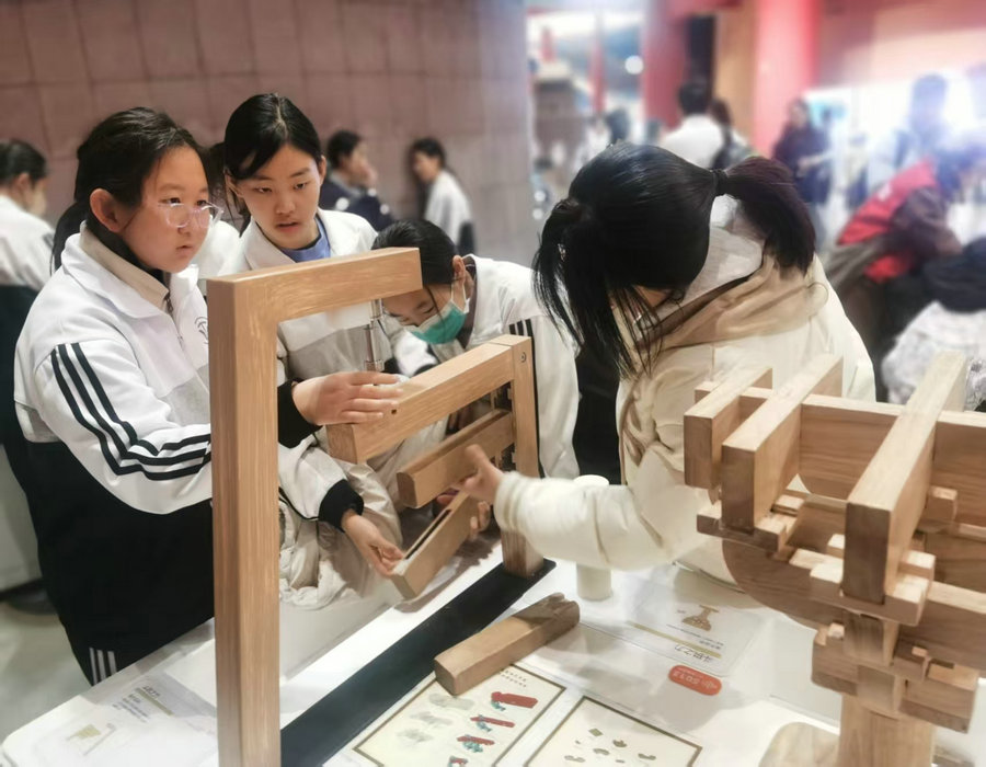 "动态木拼"项目在小礼堂展示游泳的鱼、腾云驾雾中国龙等精美作品,运用拼插结构、齿轮传动等机械原理实现动态效果;